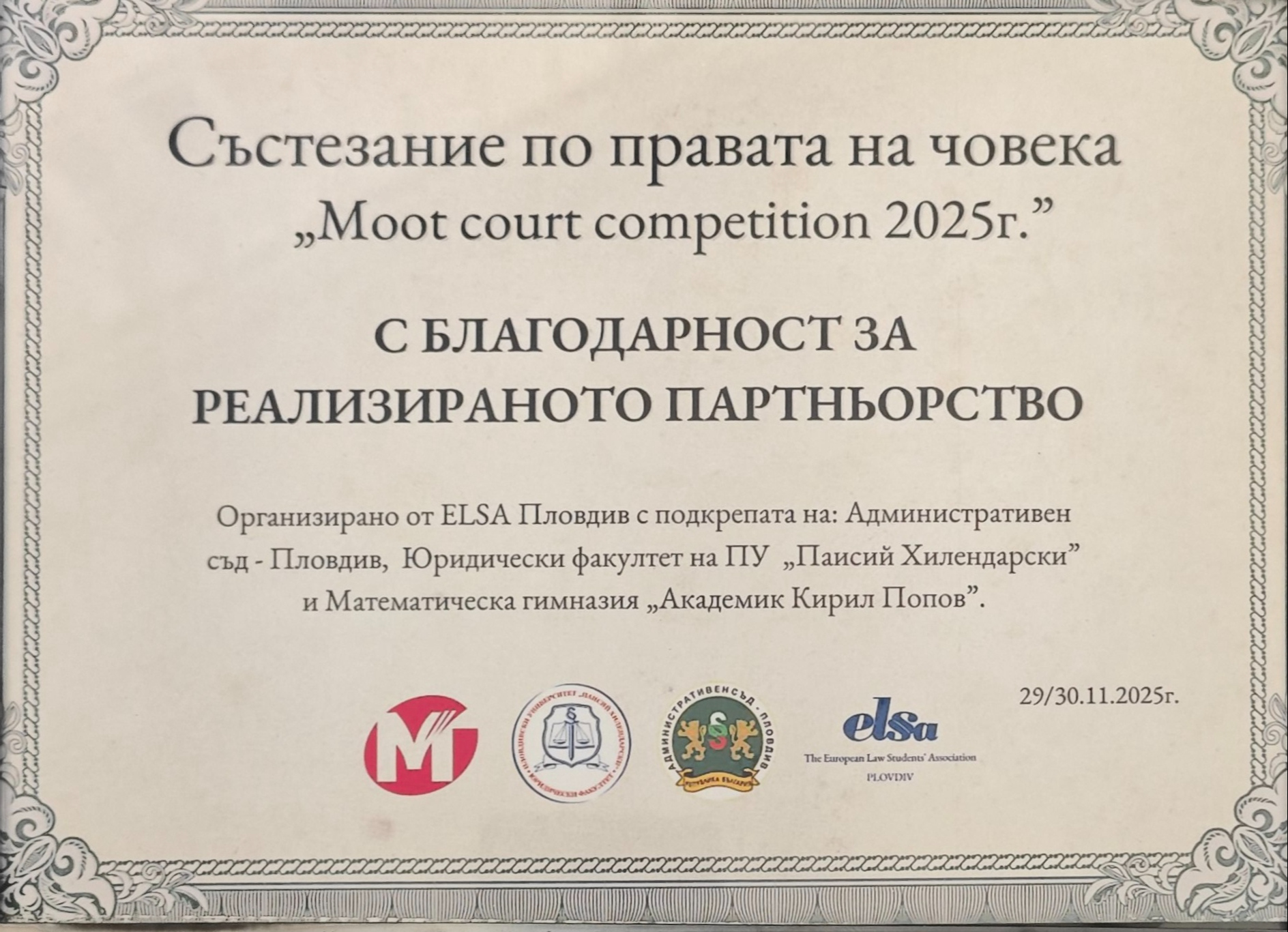 На 30 ноември Административен съд – Пловдив бе домакин на финалите на четвъртото издание на състезанието по права на човека Moot Court Competition. Състезанието представлява симулация на процес пред Европейския съд по правата на човека. Отборите се състоят от по двама участници, като участник, който няма съотборник, бива разпределен служебно с такъв. Събитието гарантира задълбочаване на познанията по Европейската конвенция за правата на човека и основните свободи, развива умения по пледиране и създава нови приятелства и контакти сред ученици и студенти. От студентския поток първите места заеха Борислав Арабаджиев, Мирослав Ганев, Божидара Божилова и Мартин Стратев, а при учениците Божана Пейкова и Андрей Айвазов от ЕГ“Иван Вазов“ град Пловдив.