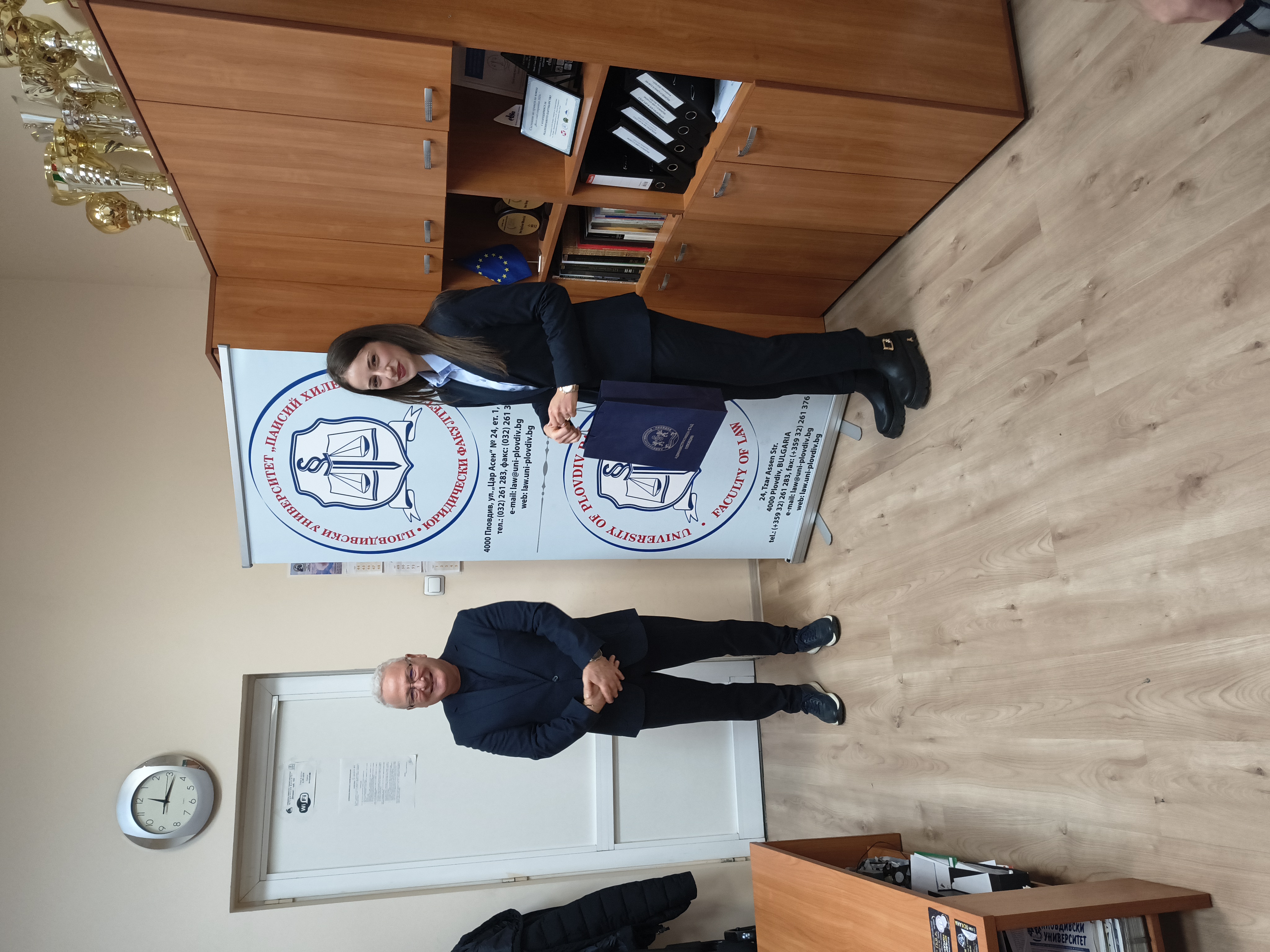 Зам.-председателят на Административен съд-Пловдив, съдия Владимир Вълчев, връчи награда на Мадлен Павлова - изявена студентка от Юридическия факултет на Пловдивския университ